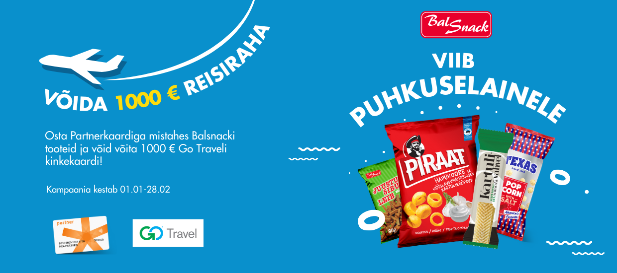 Peaauhinnaks on 1x Go Travel kinkekaart väärtuses 1000 € ja 1x Balsnacki toodete segakast.